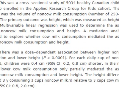 最近,多伦多圣•迈克尔医院针对牛奶摄入与儿童身高之间的联系做了一项科学研究,研究对象是5000多名加拿大2-6岁的儿童,并在权威营养学专业期刊American Journal of Clinical Nutrition发布了研究结果。研究报告显示:每天喝三杯牛奶的加拿大2-6岁儿童比同一年龄不喝牛奶的儿童平均身高高出1.5cm。(原文链接:http://ajcn.nutrition.org/content/early/2017/06/07/ajcn.117.156877.abstract?related-urls=yes&legid=ajcn;ajcn.117.156877v1)